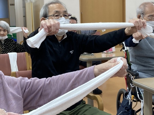 簡単なストレッチをした後、タオル体操を本格的に始めていきます♪