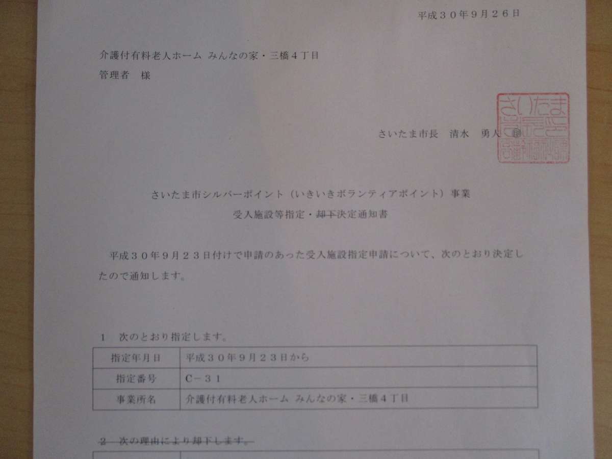 先日、さいたま市に申請した「さいたま市シルバーポイント事業受入施設指定申請の決定通知書が届きました。
