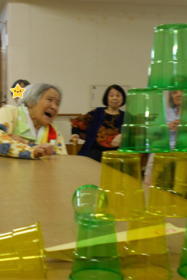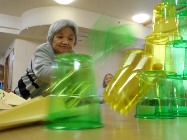 5月のレクリエーションは紙ひこうきを使ったコップ倒し、