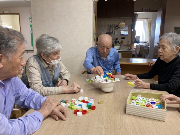 ペットボトルの蓋、鏡餅の容器を再利用して、ゲームを考案しました(^_-)-☆