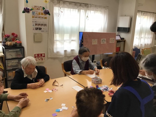 三角に折った折り紙を4枚合わせてようやく1枚のお花になるので、たくさん折っていただきます。