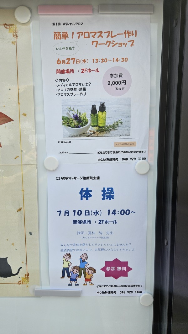 現在予定しているイベントは、【アロマスプレー作りワークショップ】、【こいめなマッサージ治療院主催の体操】♪