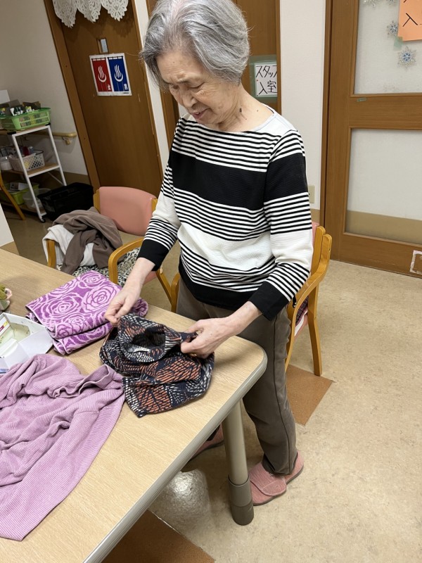 今回は2階のW様、Y様、I様に洗濯物たたみのお手伝いをしていただきました。