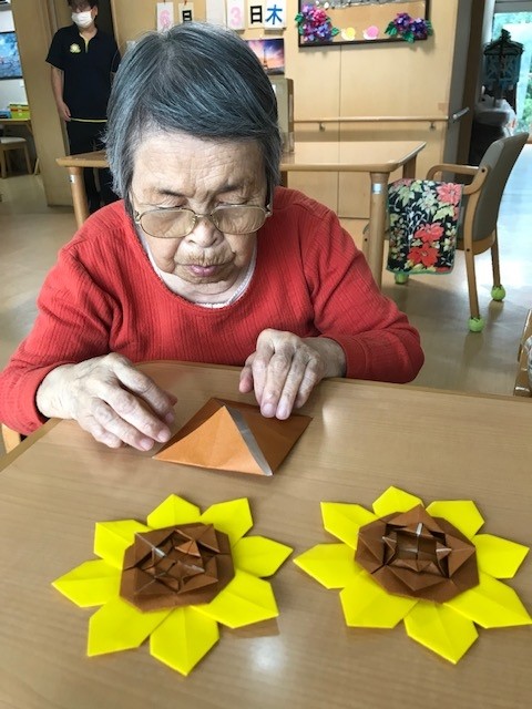 ということで、ヒマワリを折り紙で折ました。