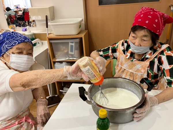 キーマカレーは、かたくりの里のシェフである佐藤センター長が作りました。そして野菜サラダとラッシーはご利用者様と作りました。