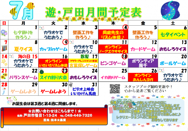 1日には七夕に向けて笹飾りを作ったり短冊を書いて頂きます!