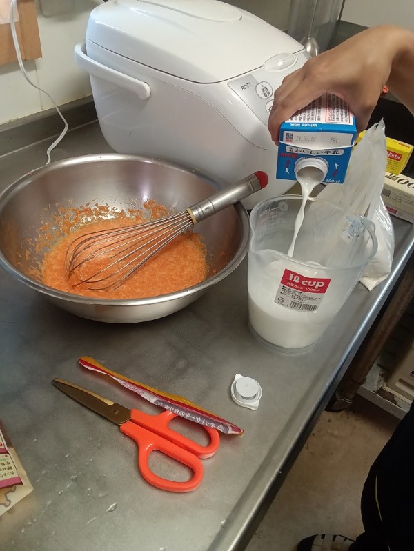 先日、移動動物園で用意した人参が たくさんあまったので 皆さんで人参パンケーキを作りました~(^^)/