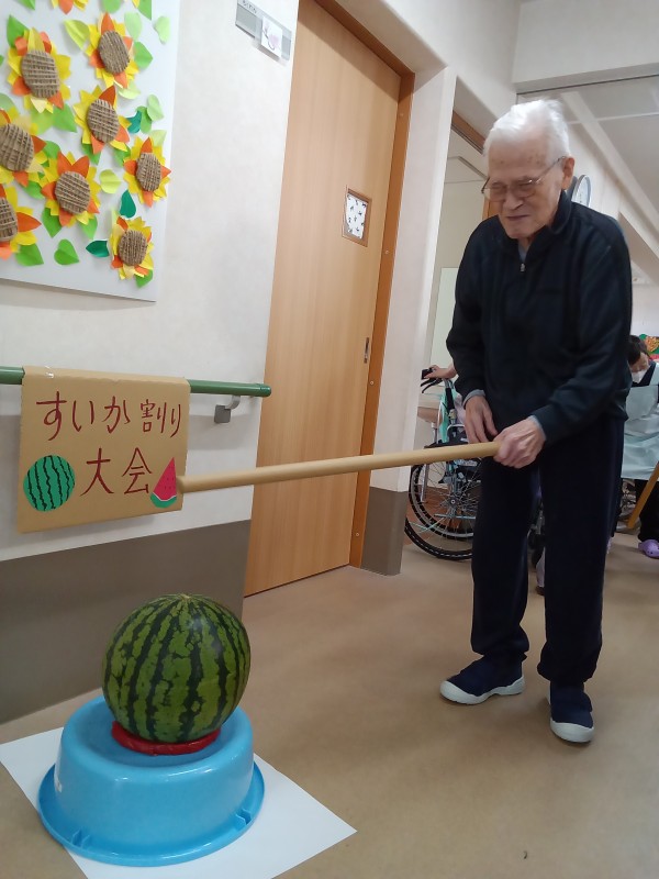 1,2,3F合同で盛大にふれあい喫茶⇒スイカ割りレクリェーションを行えて