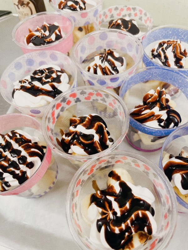 たこ焼きは油で上げ焼きにしました。ソースマヨが食欲をそそります。チョコバナナは生クリームとチョコレートのトッピングでホーム長の可愛いお手製カップに入れてお出ししました。