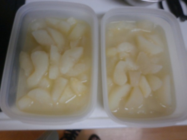 3. ご家族より果物や野菜を頂きました。ご本人にお聞きしたら、梨は堅いから柔らかい方がいいと言う事でコンポートに。ピーマンは味噌和えかなと。お口にあったでしょうか?