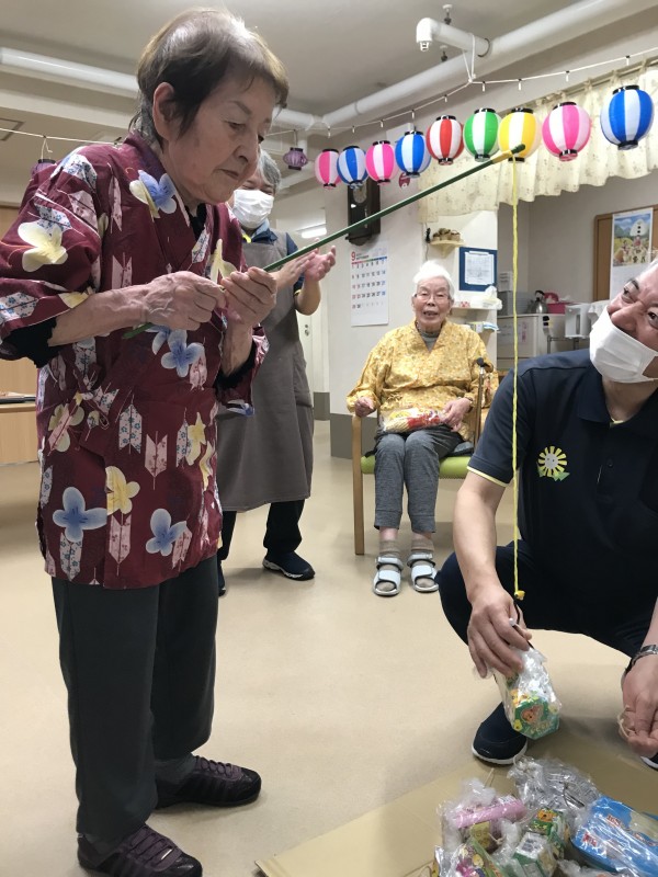 利用者様もヨーヨーやお菓子が釣れると大変喜ばれ焼きそばも手作りで熱々出来立てを提供