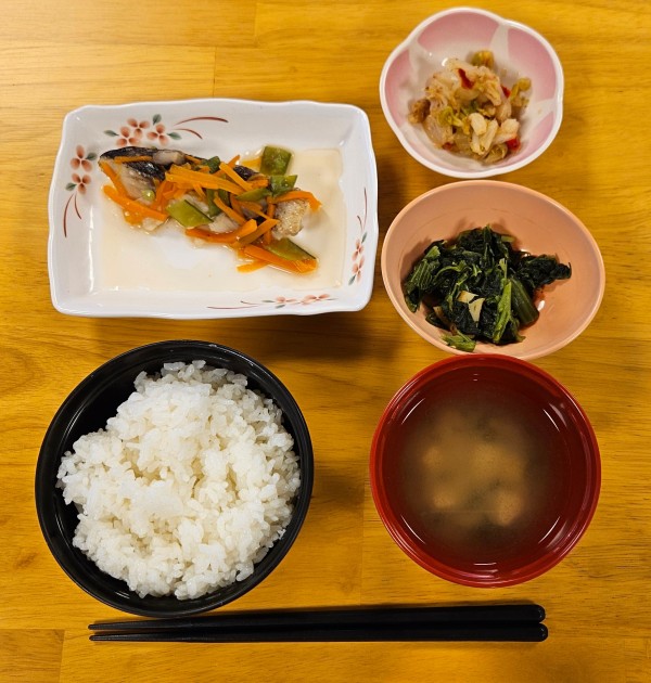 お昼の献立【ご飯】【お味噌汁】【メバルのさらさ蒸し】【ほうれん草の和風炒め】【白菜のおかか和え】です(*^-^*)