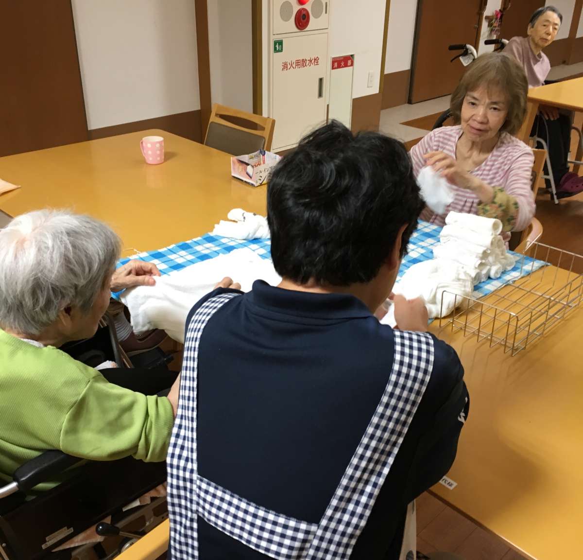 フロアの方からとても楽しそうな笑い声が聞こえてきました。利用者様と職員でおしぼりたたみをしながらなんだかとても盛り上がっています。
