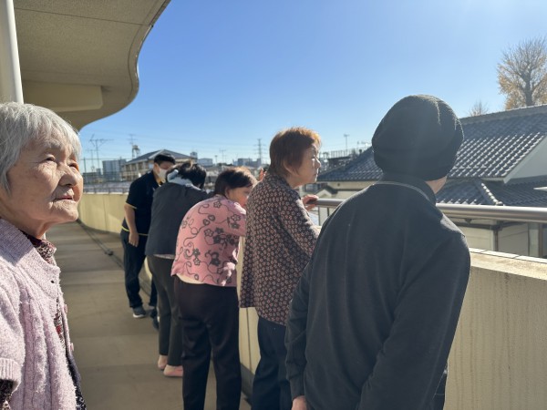 雲ひとつない青空が広がるなか、ベランダを皆さんで散歩中です!