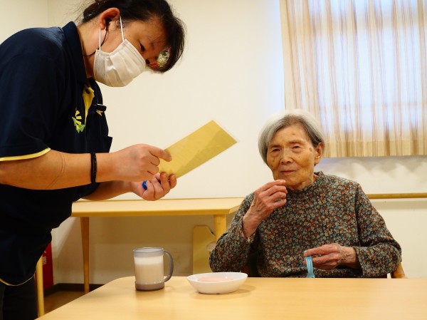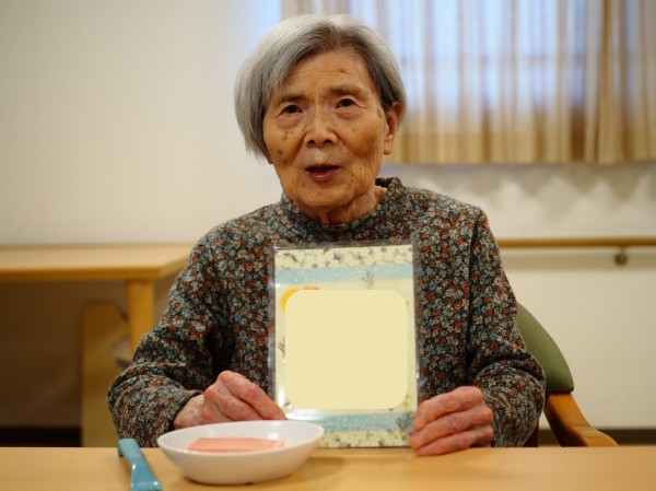 職員から色紙を渡されてにっこりされていました。