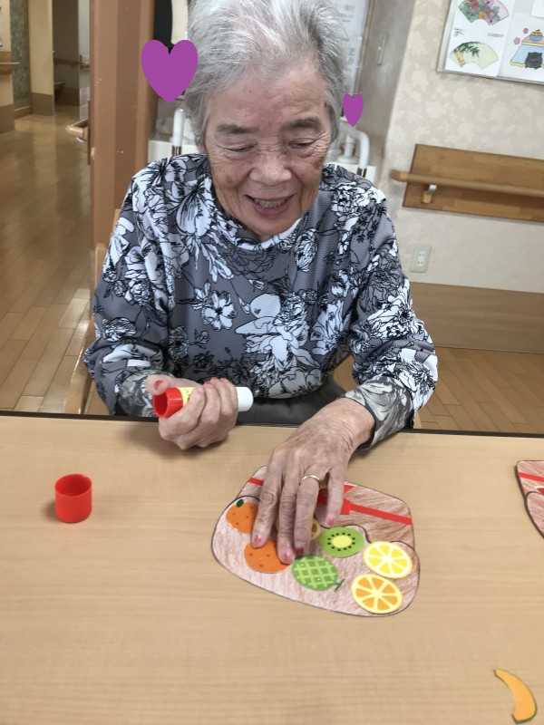 画用紙で作ったチョコレートケーキにフルーツを貼って盛り付けて頂きました。