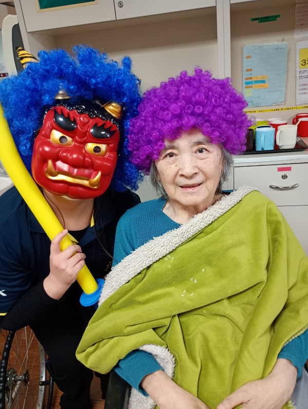 ご利用者様には鬼仕様のかつらをかぶっていただきました。
