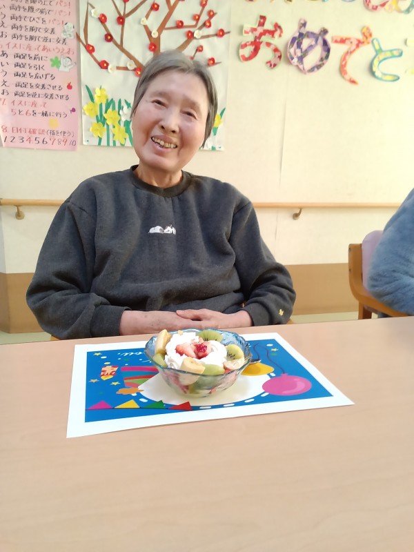 お祝いデザートは職員手作りのプリンアラモードです♪