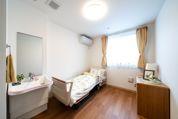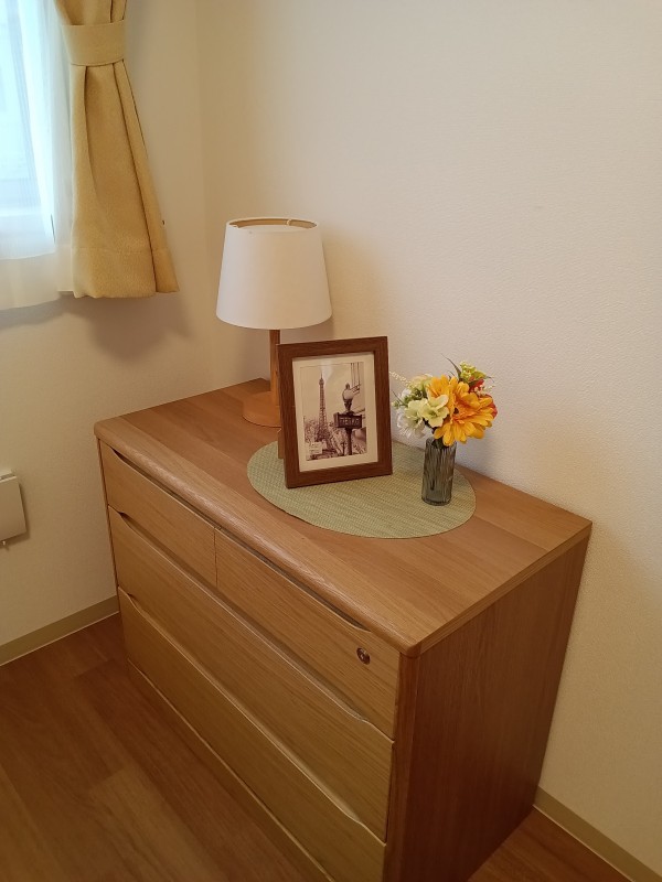 居室内には、介護用電動ベッド、寝具、カーテン、エアコン、洗面台、チェスト、クローゼット、緊急コール、照明がセットされておりますが、使い慣れている寝具であったり、家族のお写真、思い出の物やぬいぐるみ、テレビやラジオなどなど、ご自宅からお持ち込みいただくことは可能です。