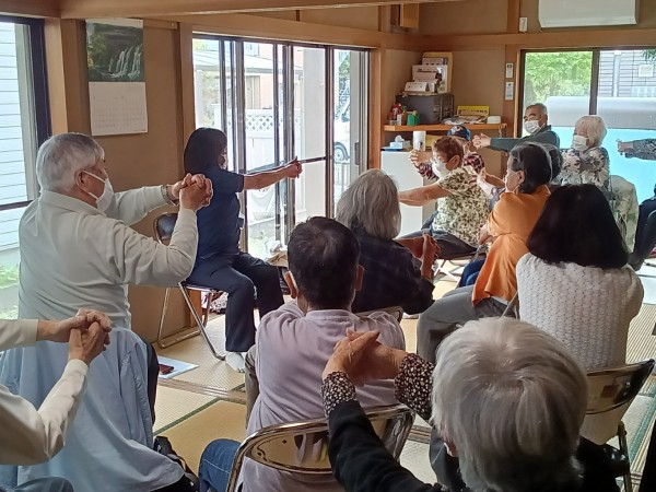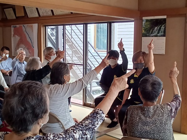 水分補給の休憩を挟み、グループホームの職員さんによる体操です。歌を唄いながら身体も動かす・・・こちらも同じく脳トレです。