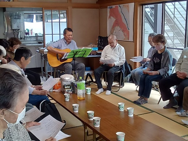 脳と身体をたっぷり動かした後は、お茶&歌タイムです。パンとお茶やコーヒー・ジュースをいただきながら、ボランティアの三村さんが弾いてくださるギターに合わせて童謡を中心に歌謡曲も交え皆さんで楽しく唄いました。