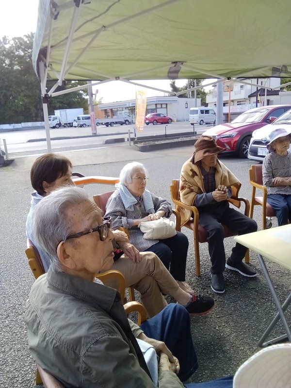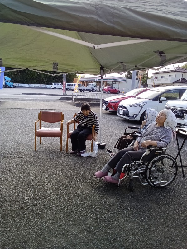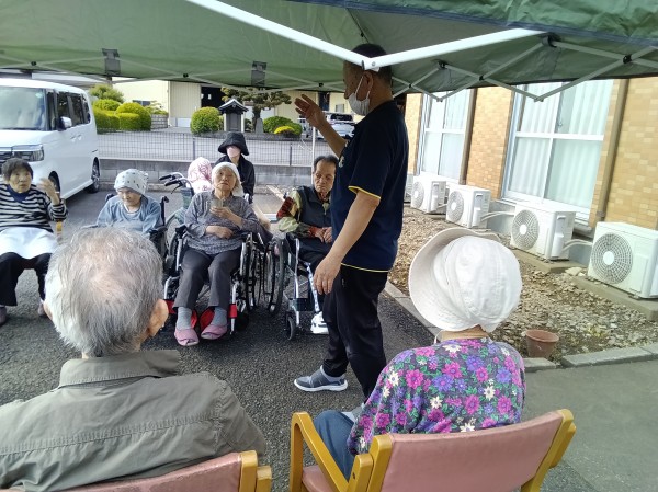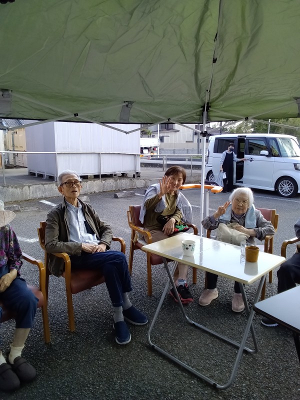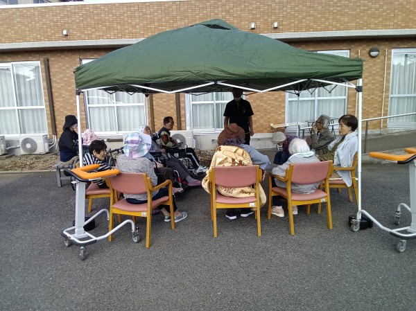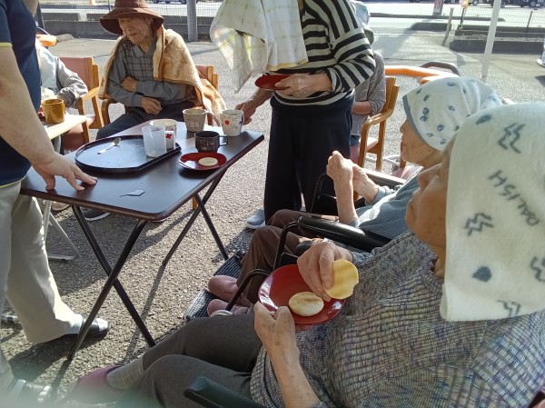 太陽の下で大きなテントを出して皆さんで食べるおやつは