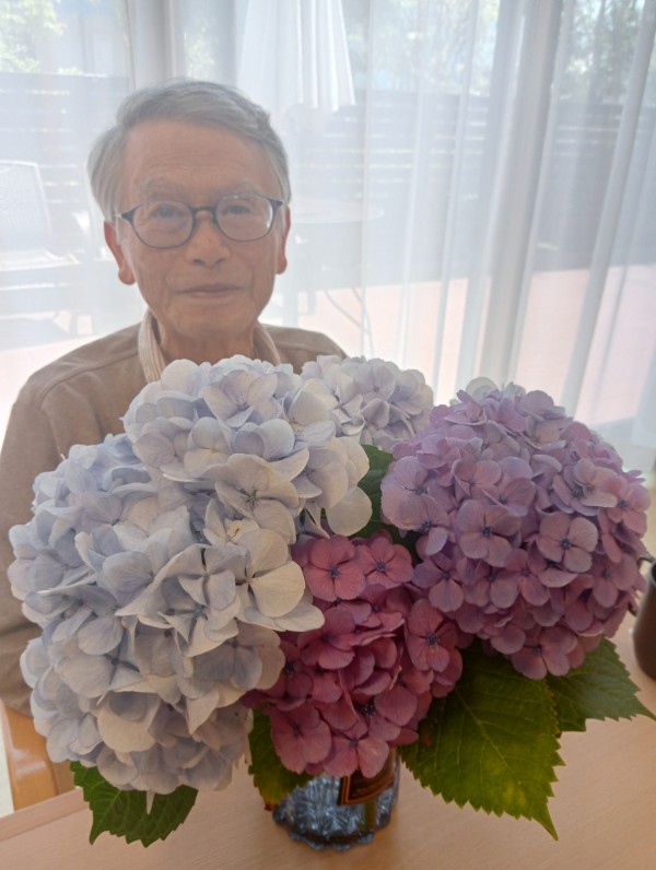 せっかくなので季節を感じていただこうと、あじさいを切って皆様のところに持っていくと。
