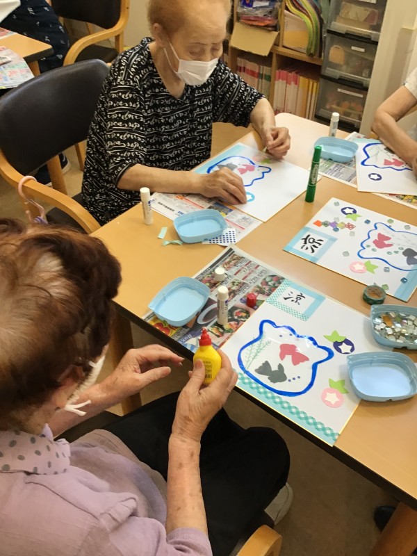 今月の作品は夏らしい飾り物になります。色紙の金魚鉢には金魚が泳いでいて、ご自宅に飾っていただけると暑い夏も涼しく感じてきそうな気がしてきます。
