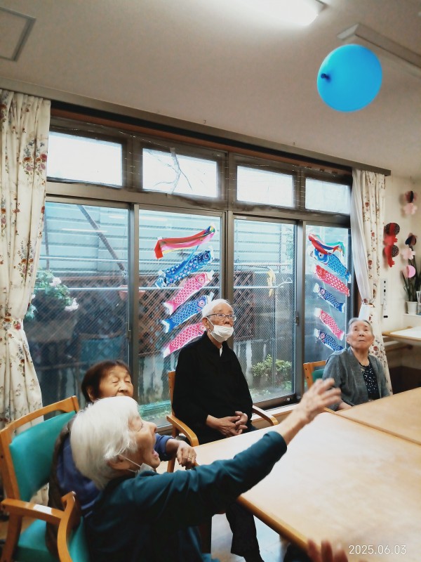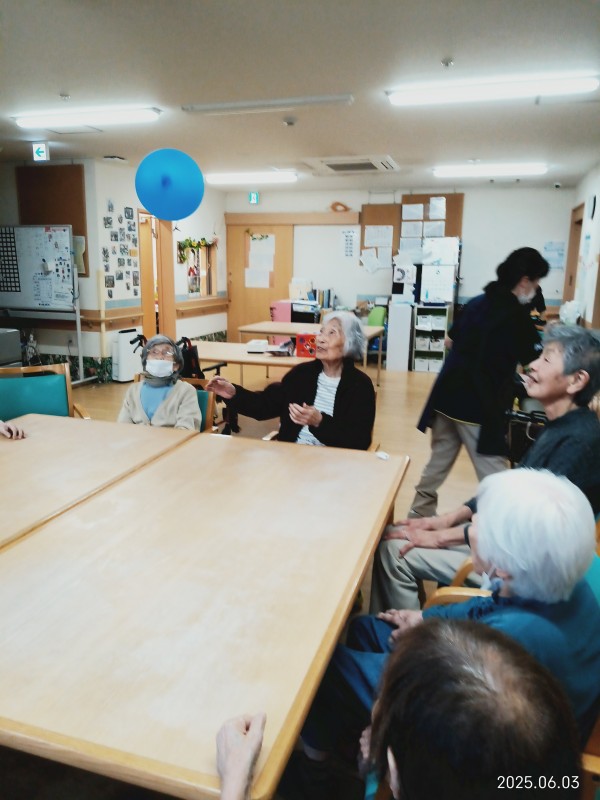 風船バレーは普段なかなかレクに参加できないような利用者様でも風船が目の前に来ると条件反射でアタックします!