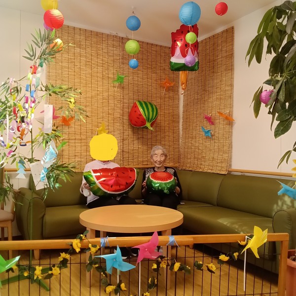 七夕飾り・・・今回は2階のスペースに飾りつけです。