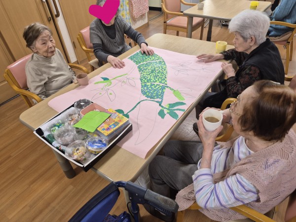 こちらに利用者様がこつこつとちぎり絵をしてくだり、