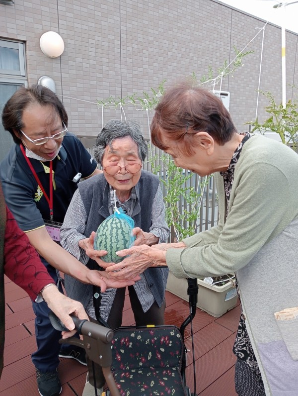 今のうちに大きくなったスイカを収穫しましょう。ということで3階のお客様と4階テラスへ。