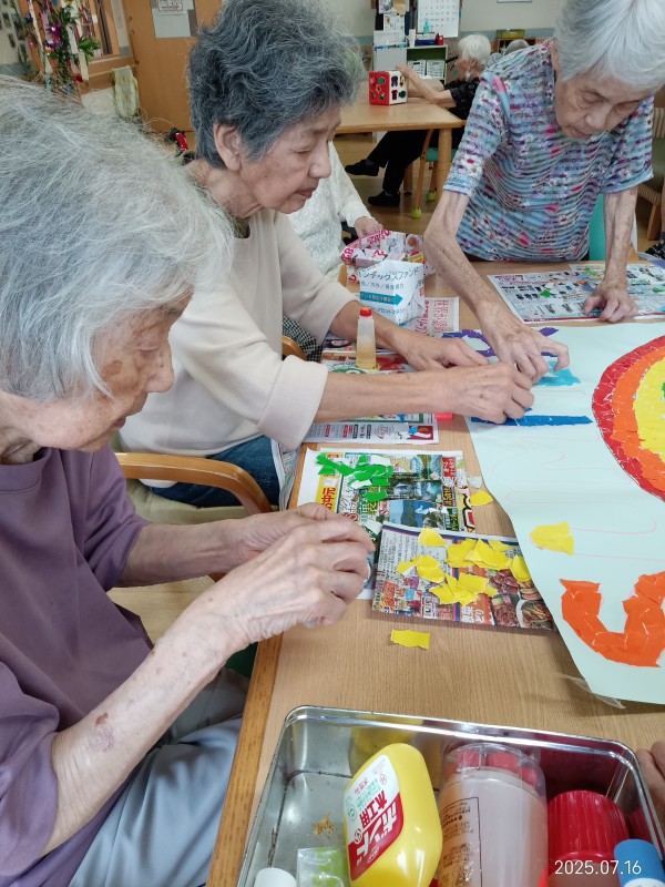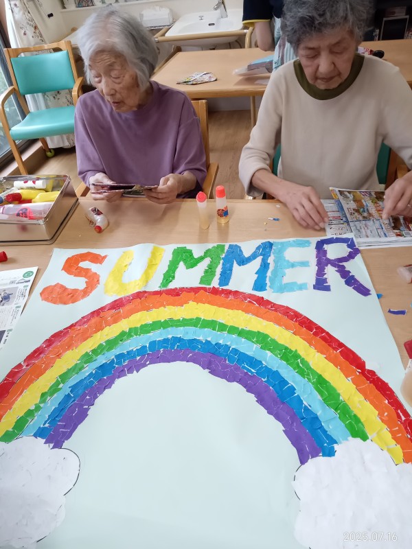 皆で折り紙をちぎって虹の貼り絵を作りました。