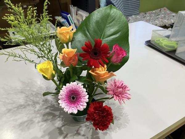 夏なのでお花を少しでも長持ちさせるには短く切ること!!とのことで全体的にショートにしてのアレンジメントでした!!