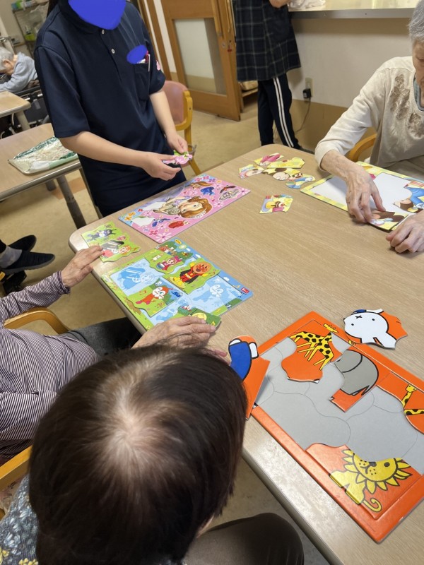 今回は1階の皆さんに脳トレーニングのレクにてジグソーパズルをしていただきました。