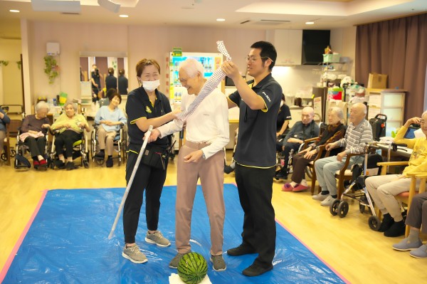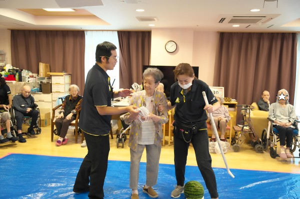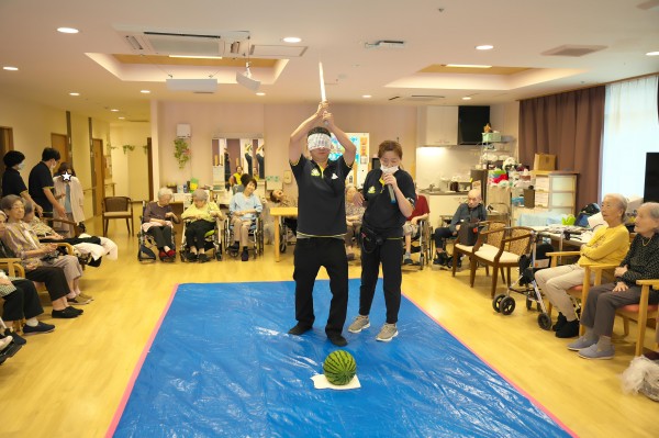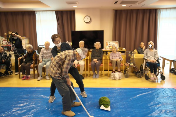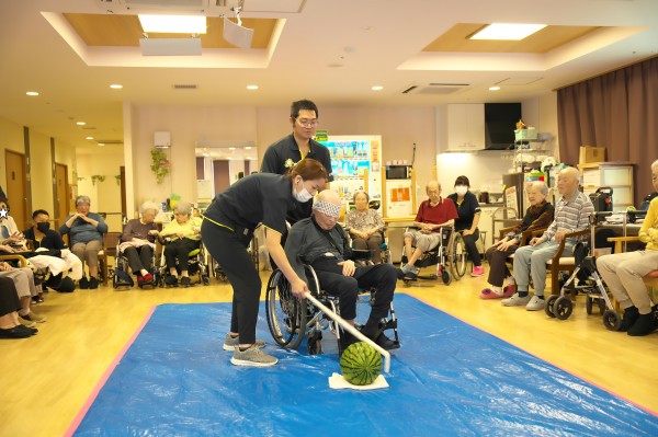 今回は毎年恒例のスイカ割りの様子をご覧いただきたいと思いますー!!