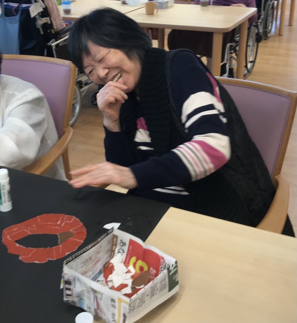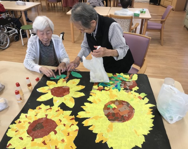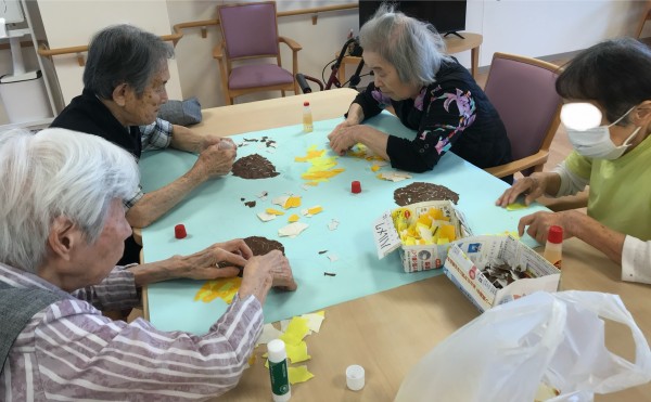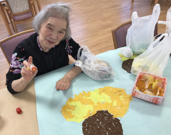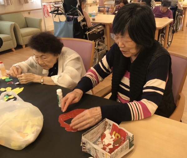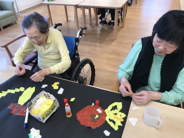 下書きに沿って折り紙をペタペタと。。。皆んなで相談しながらバランスよく貼り付けています♡