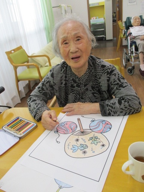 コスモスの塗り絵を行っています( ^ω^)・・・ オレンジやピンクの色で塗られたコスモスのお花綺麗ね! と話されていました(*^_^*)