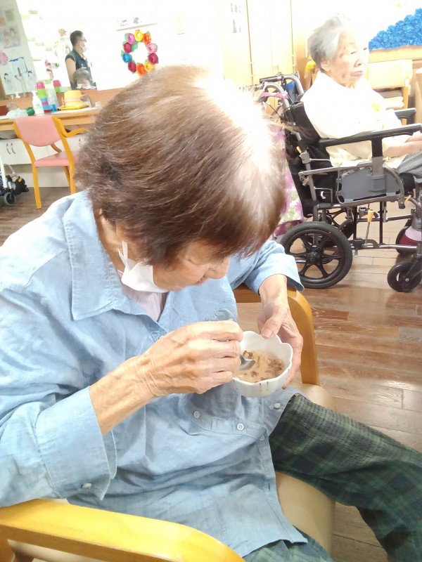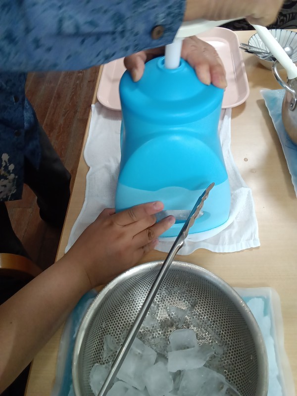 今日はあまり天気が良くなかったですが、水分摂取を促すためにかき氷を作っておやつに提供しました!(^^)!。