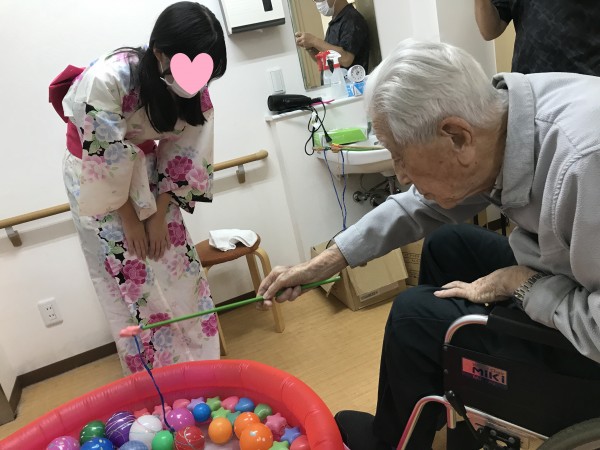 食事のあと は射的、ヨーヨー釣り、輪投げ会場を順番に回ってもらいお祭り気分を味わって