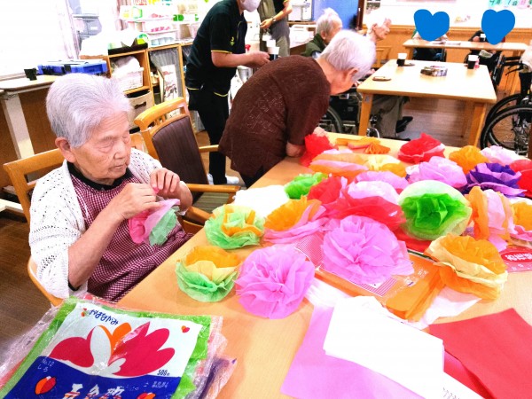 いろんな色の花紙を使ってたくさんのお花を作っているようです。