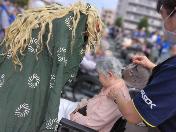 先日、地域のお祭りがありました。当ホームにもおみこしやひょっとこ等が回ってきました♪