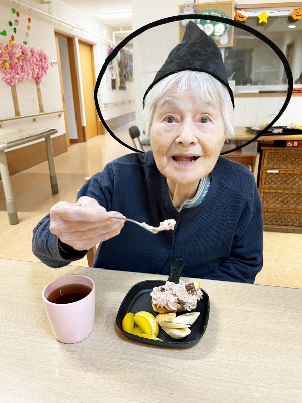 今月お誕生日を迎えられたのはⅯ子様(91歳)。職員よりささやかなお祝いの色紙を送らせていただきました。そして「お誕生日の抱負を一言お願いします。」とお伝えするとⅯ子様はにこやかに「これからも健康で、みんなと仲良く暮らしていきたいです。」とお話しくださいました。その優しい言葉に温かい拍手が起こりました。そして、ハロウィンが近いこともあり、K子様とY様は魔女の帽子とマントを身にまとい、かわいい仮装で参加。お二人は「ハッピーバースデー♪」の歌を大きな声でノリノリに歌ってくださり、笑顔と笑い声でいっぱいになりました。ケーキを配ると、「これ今作ったの?美味しそう!」とⅯ子様。一口食べて「美味しいねぇ」と笑顔を見せてくださいました。Y様はフォークを手に嬉しそうにぱくり!K子様は「わぁ~すごい!美味しそう!」と目を輝かせながら、黙々と味わっておられました。O様は1番に食べ終わると満足そうな笑顔。(*´▽`*)