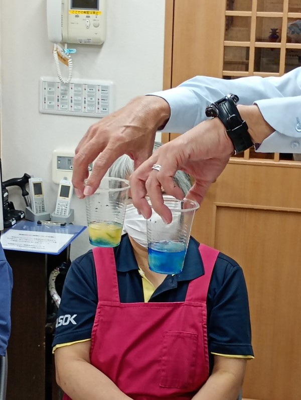 今コップにお水を入れてあります。それに特殊なPHを確認する液を入れます…そうするときれいな濃いブルーになりました。