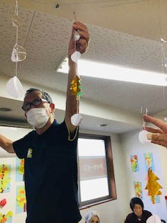 皆さんのモビールを背の高いお兄さん(笑)に、