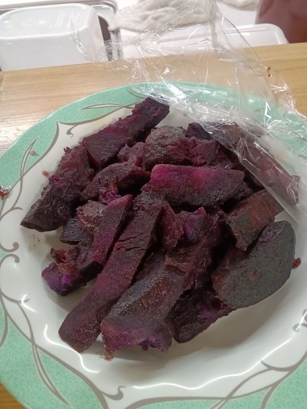 今年のさつま芋は残念ながら不作で、安納芋もあったようですが収穫出来たのはむらさき芋だけでした…m(__)m明け番の職員さんがむらさき芋を蒸してくださり各フロアで少しずつですが美味しく頂きました♪