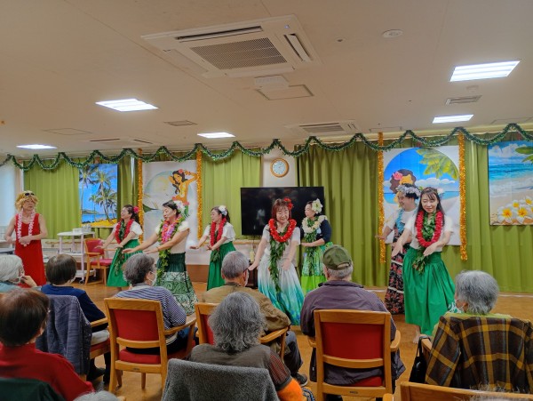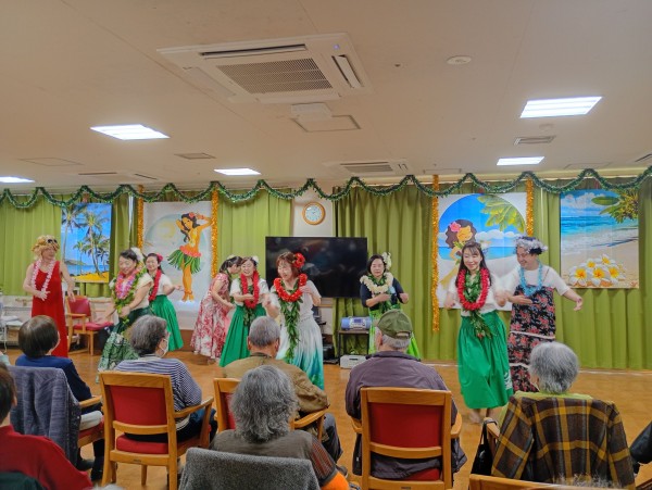 今回は、先日、1階デイサービスにて行なった「フラダンス」の様子をお伝えします。