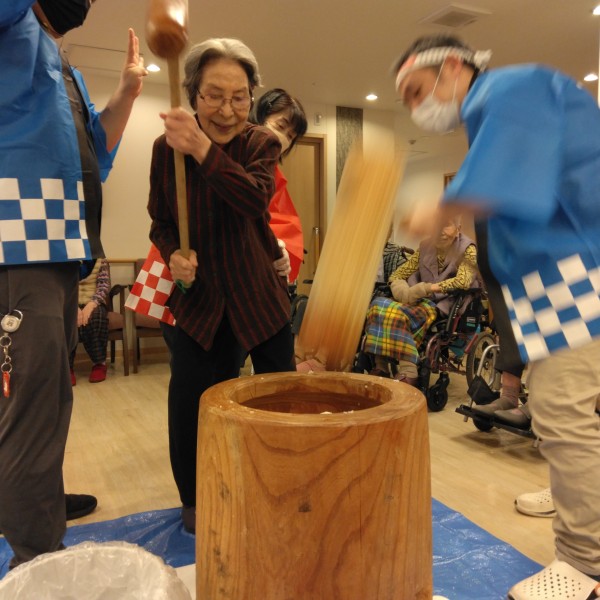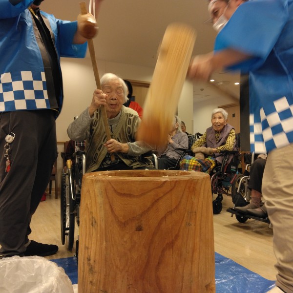 最初は少しこねる為にホーム長と男性スタッフでつき始めました 大きな音が響きます