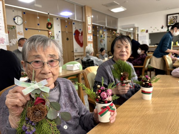 各テーブルに地域の方とホームご利用者様、職員が一緒にクリスマスの飾りを作りました♪