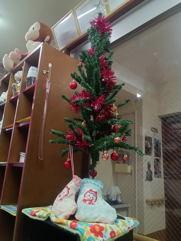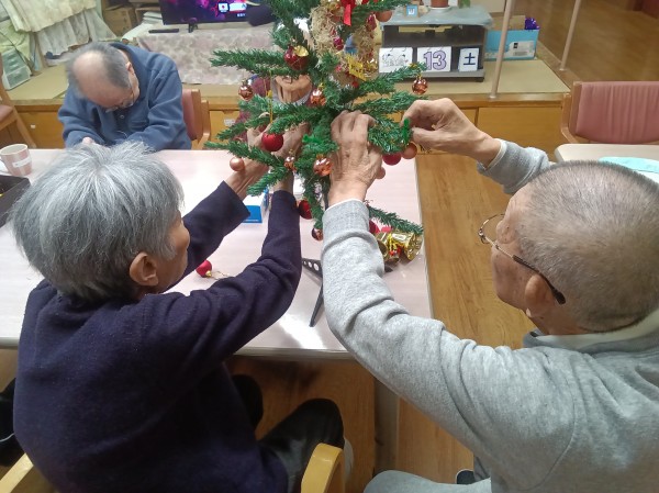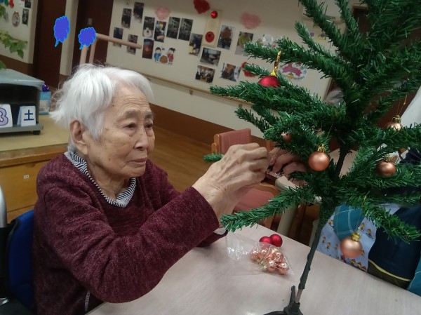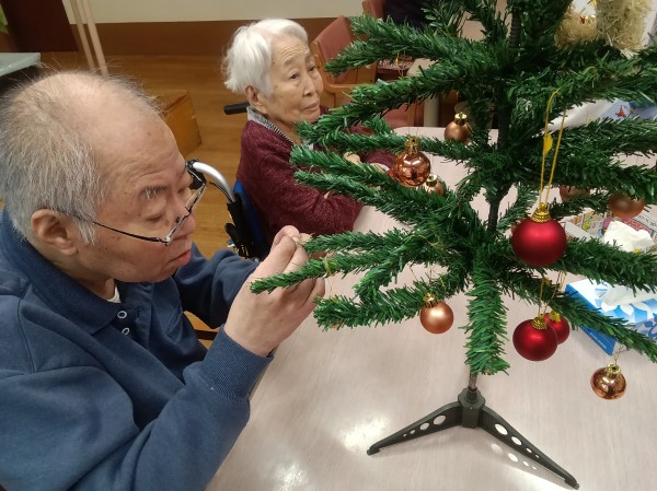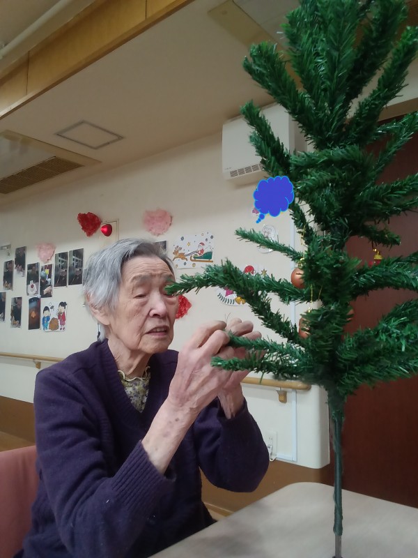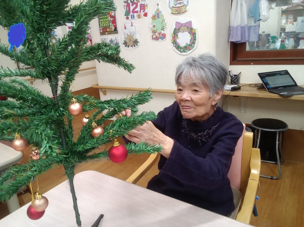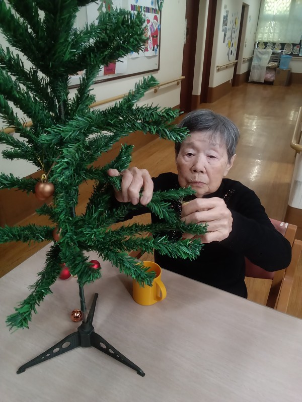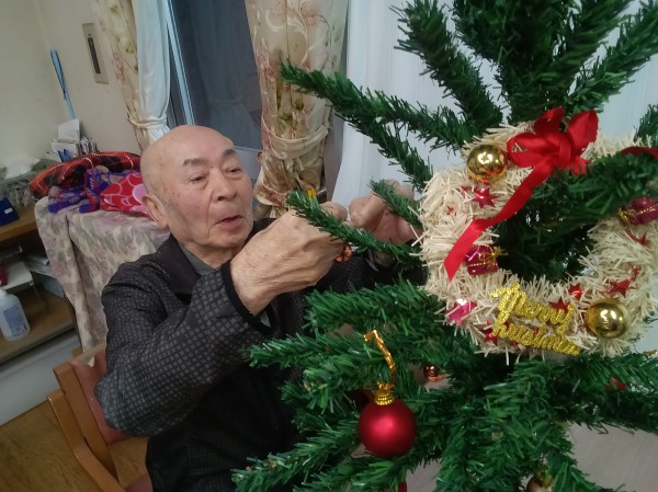 ホーム玄関に置くクリスマスツリーの飾りつけを、ご利用者様にお願いしました。